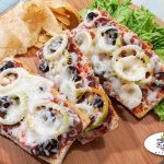 Homemade French Bread pizza is fun to make, and so easy because you don’t need a pizza dough. We topped this with store-bought pizza sauce, Mozzarella Cheese, Spicy Pepper Beef Franks, White Onion, Black Olives, Green, and Red Bell Pepper.