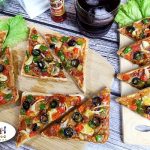 - Add on top mushrooms, bacon slices, bell peppers, onions and black olives.